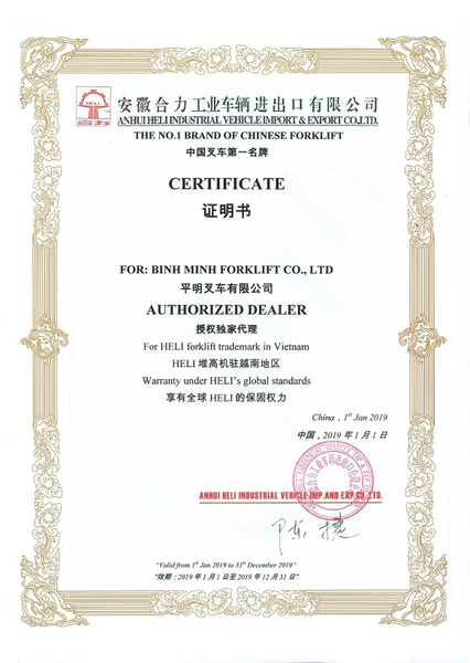 Chứng nhận Đại lý PP Độc quyền Xe nâng Heli tại Việt Nam